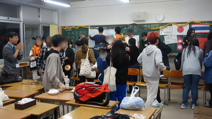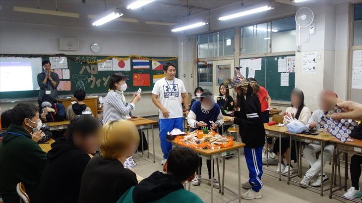 The students were already there, and the Halloween party started when we entered. First, each person gave a brief self-introduction, followed by a bingo game with sweets as prizes, and ended with a commemorative photo session.・・・・