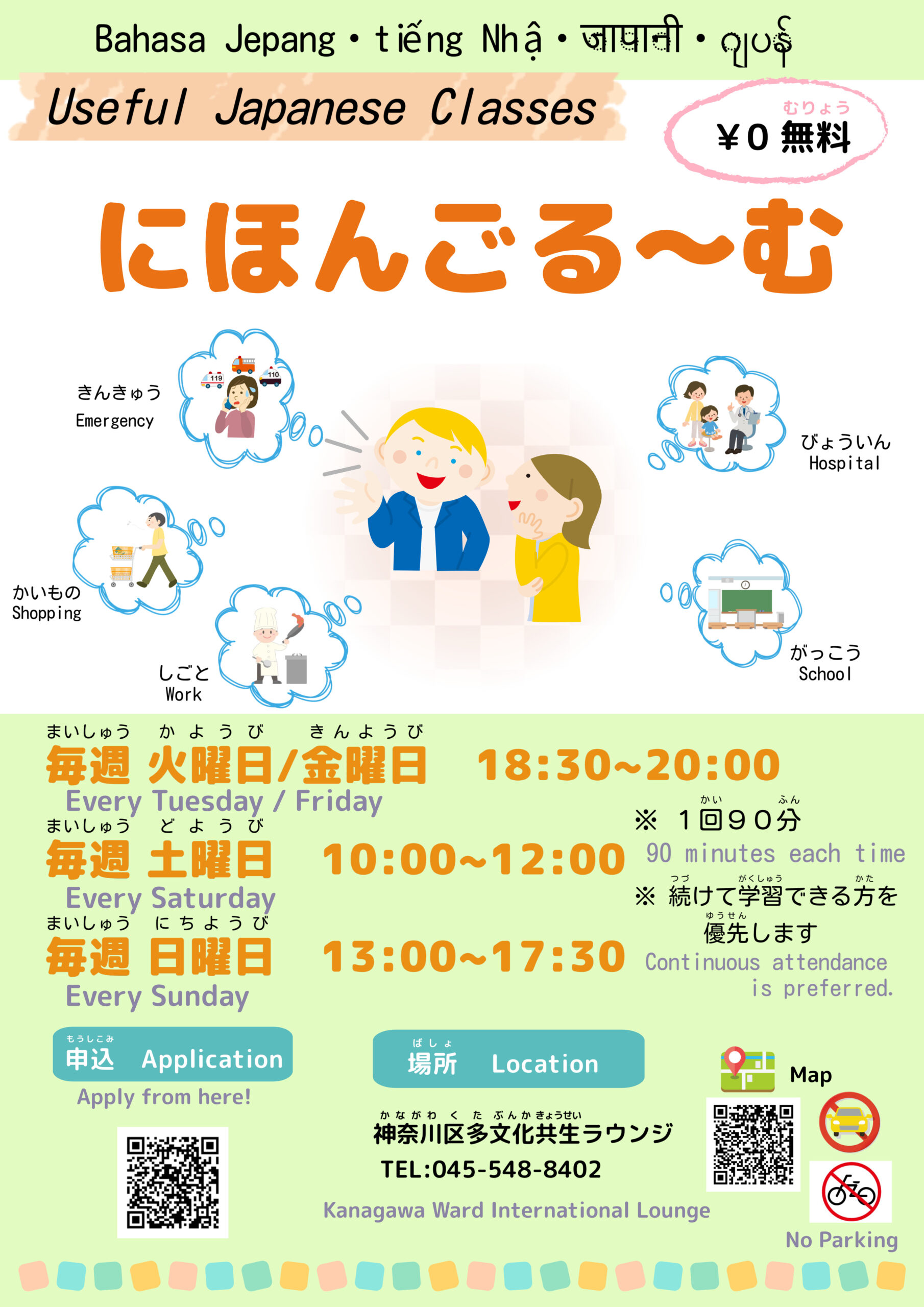 日语课程每周二、周五晚上以及周六、周日在神奈川区多元文化共生中心开设。